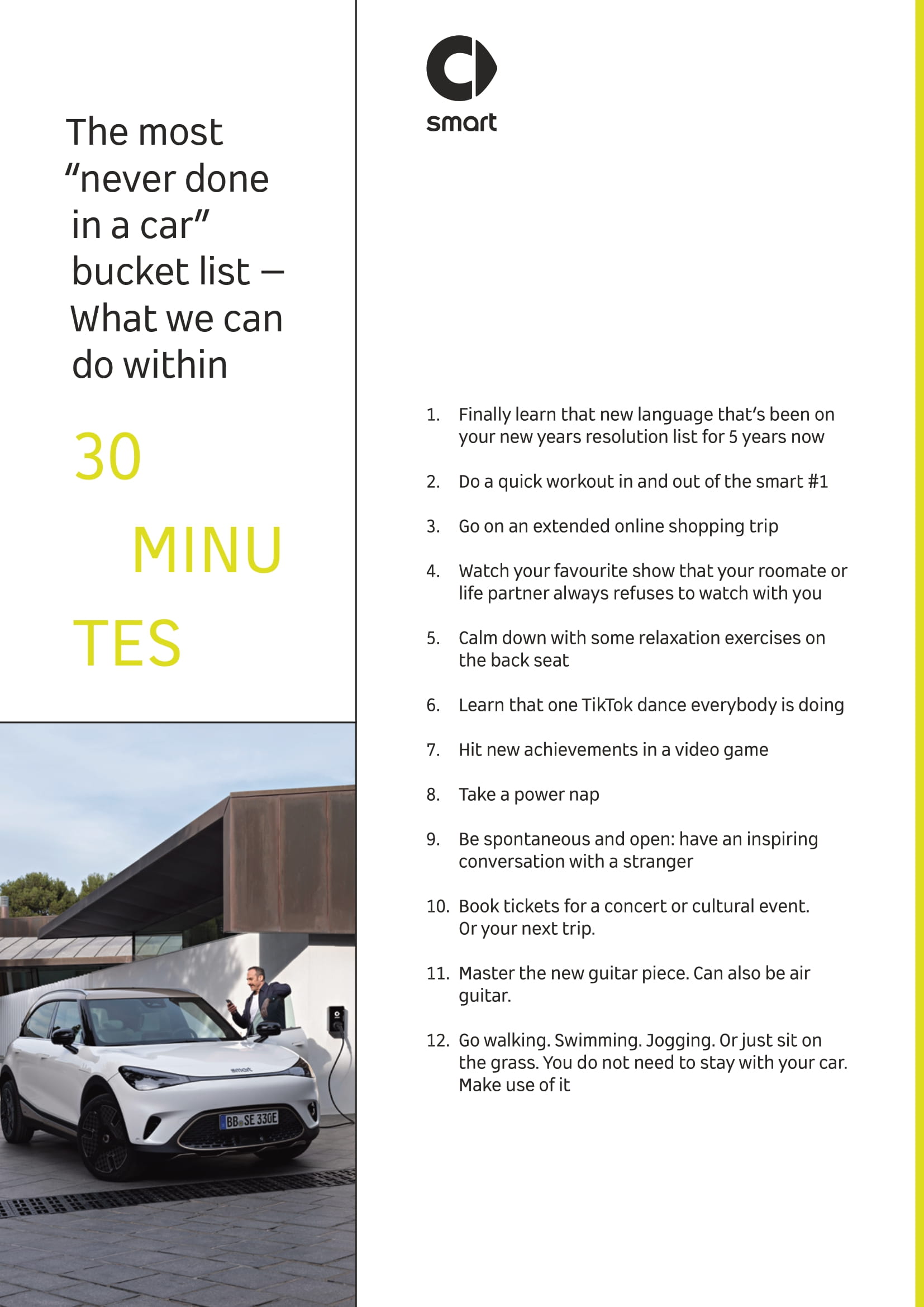 Since EV-charging frees up time for personal needs, it can be used not only for recreation but also for learning new things. Since smart offers convenient access to a reliable network for en route and destination charging thanks to the partnership with DCS, learning new things can be easily done on the go.
