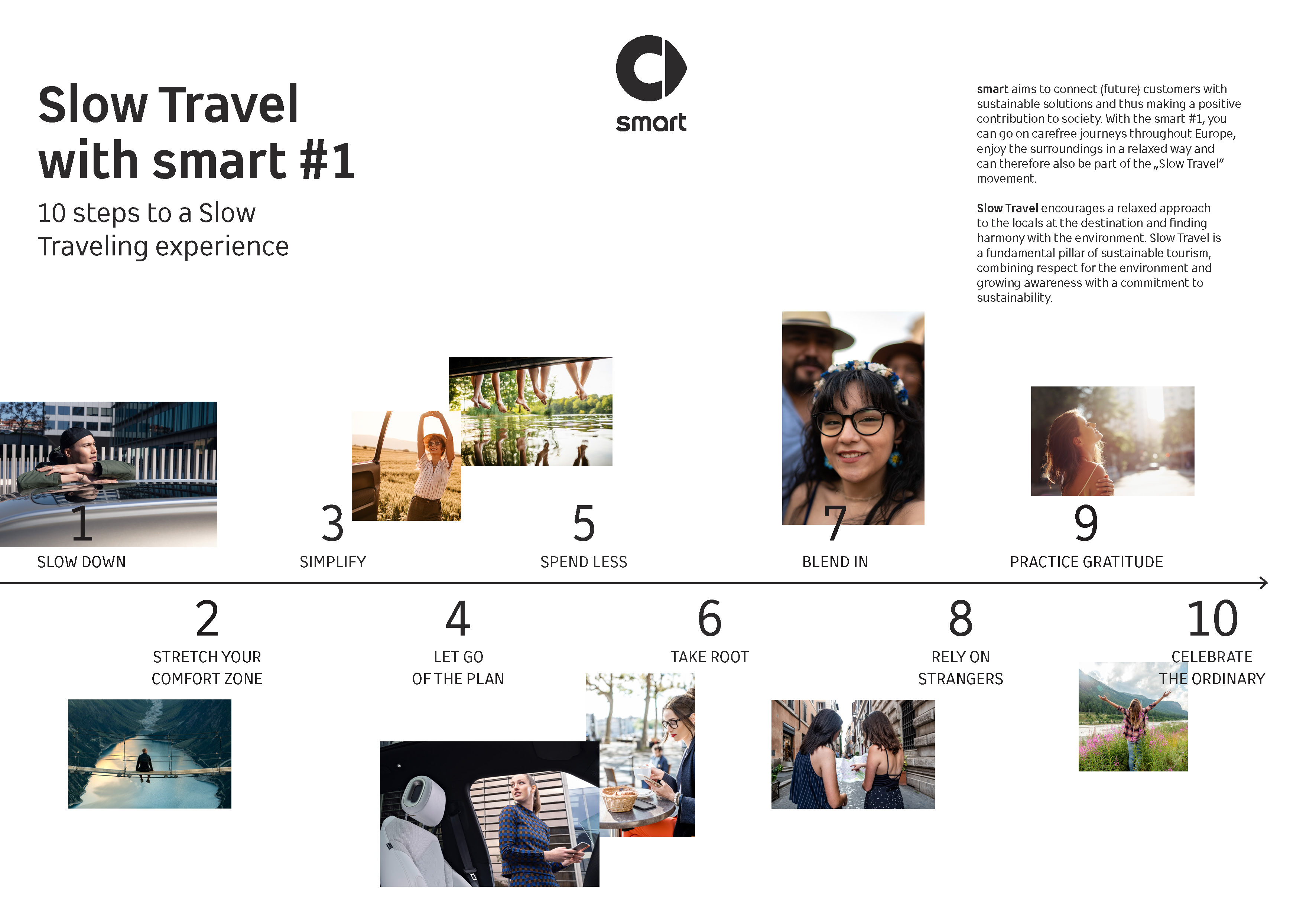 smart aims to connect future customers with sustainable solutions and thus make a positive contribution to society. With the smart #1, you can go on carefree journeys throughout Europe, enjoy the surroundings in a relaxed way and can therefore also be part of the „Slow Travel“ movement.