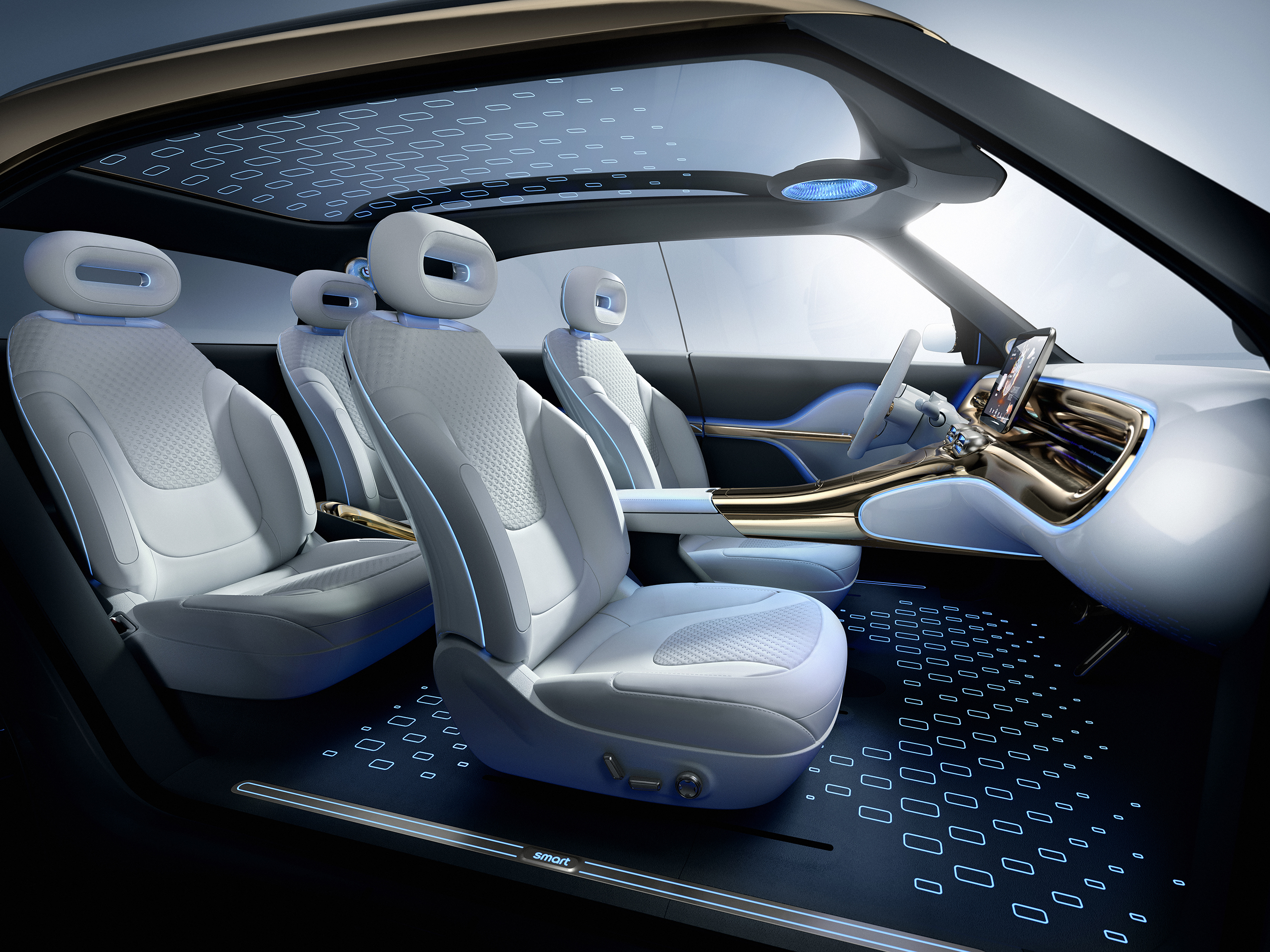 A first hint of the new dimension of digitalisation of future smart vehicles is provided by the concealed door handles, which are merely indicated by light elements. The rear doors of the smart Concept #1 are hinged at the back and open in the opposite direction from the front doors. This portal door concept makes it particularly easy to get in and out of the car. Plus, the absence of a B-pillar facilitates an unobstructed view of the generously dimensioned interior when the doors are open.