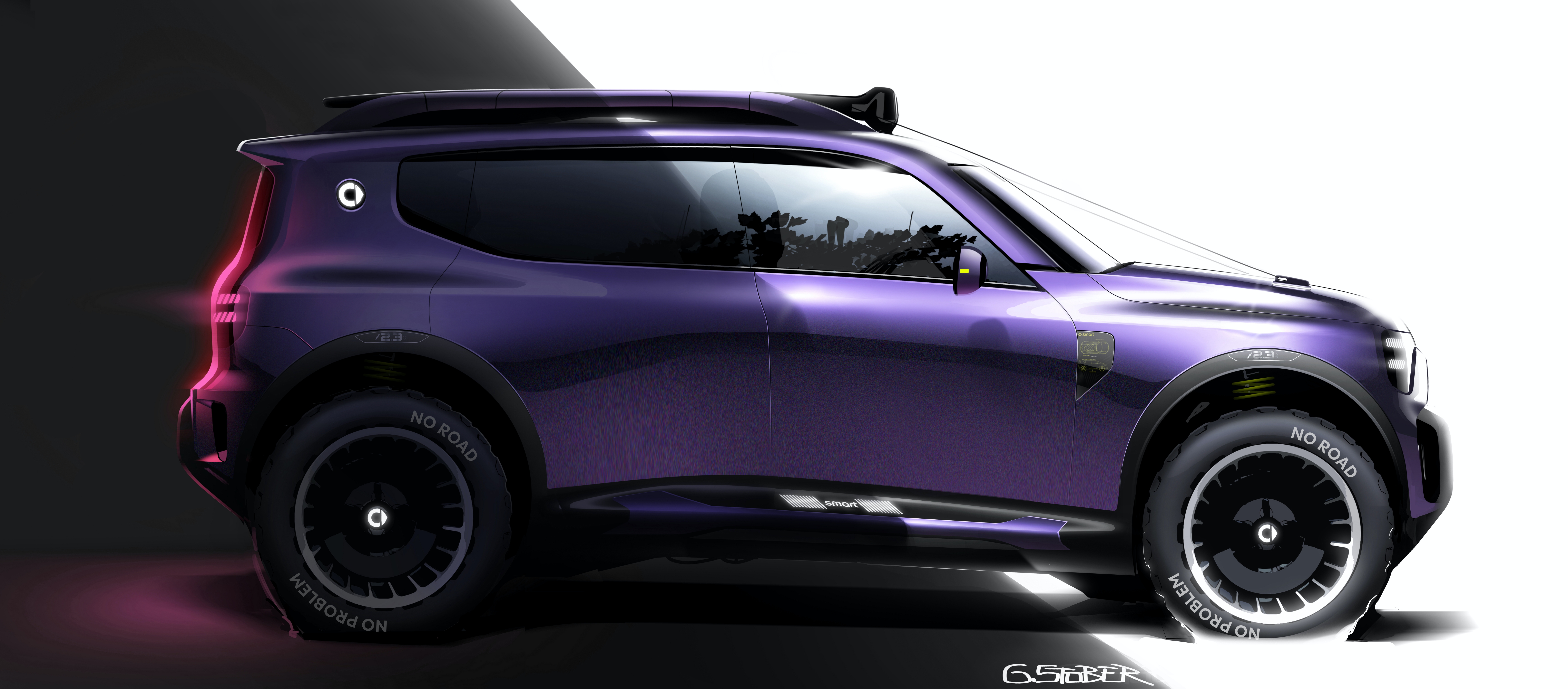 L'extérieur souligne le caractère aventureux du Concept smart #5 avec son apparence générale robuste, ainsi que ses caractéristiques technologiques et de design uniques. Avec sa silhouette carrée et droite et sa structure distinctive sur le toit, l'allure du Concept smart #5 est un engagement en faveur de la performance et une déclaration de style.