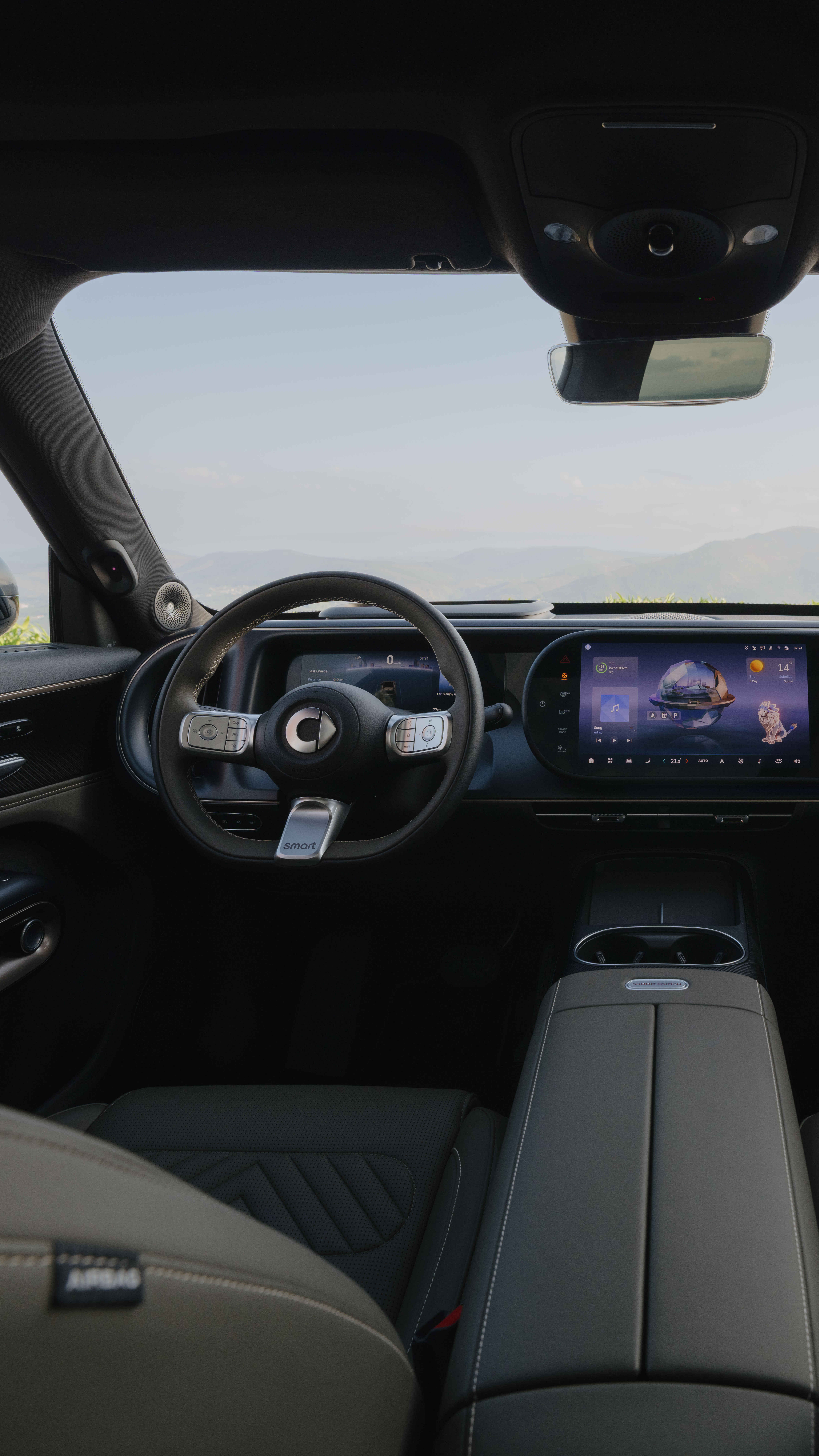De kern van het digitale ecosysteem van de smart #5 wordt gevormd door de nieuwste generatie AMD V2000-chipset, die een intuïtieve en responsieve human-machine-interface (HMI) aandrijft. Dit geavanceerde systeem beschikt over een opnieuw ontworpen 25,6-inch Augmented Reality head-up display[6], een 10,25-inch Full HD digitaal instrumentenpaneel en twee 13-inch OLED-schermen voor het midden en de passagierszijde[7], wat zorgt voor een naadloze en interactieve gebruikerservaring. De verbeterde AI-ondersteunde spraakbediening, gecombineerd met de nieuwe digitale avatar ‘Leo‘, biedt begeleiding en handsfree bediening van diverse voertuigfuncties. Daarnaast biedt het nieuwe besturingssysteem (smart OS 2.0) geoptimaliseerde EV routeplanning en een nieuw videocentrum dat videostreaming in de auto mogelijk maakt. Dankzij de 3D-engine van Unreal zijn de displaygraphics zeer vloeiend en gedetailleerd en maken ze eenvoudige bediening van alle functies van de digitale gebruikersinterfaces mogelijk.