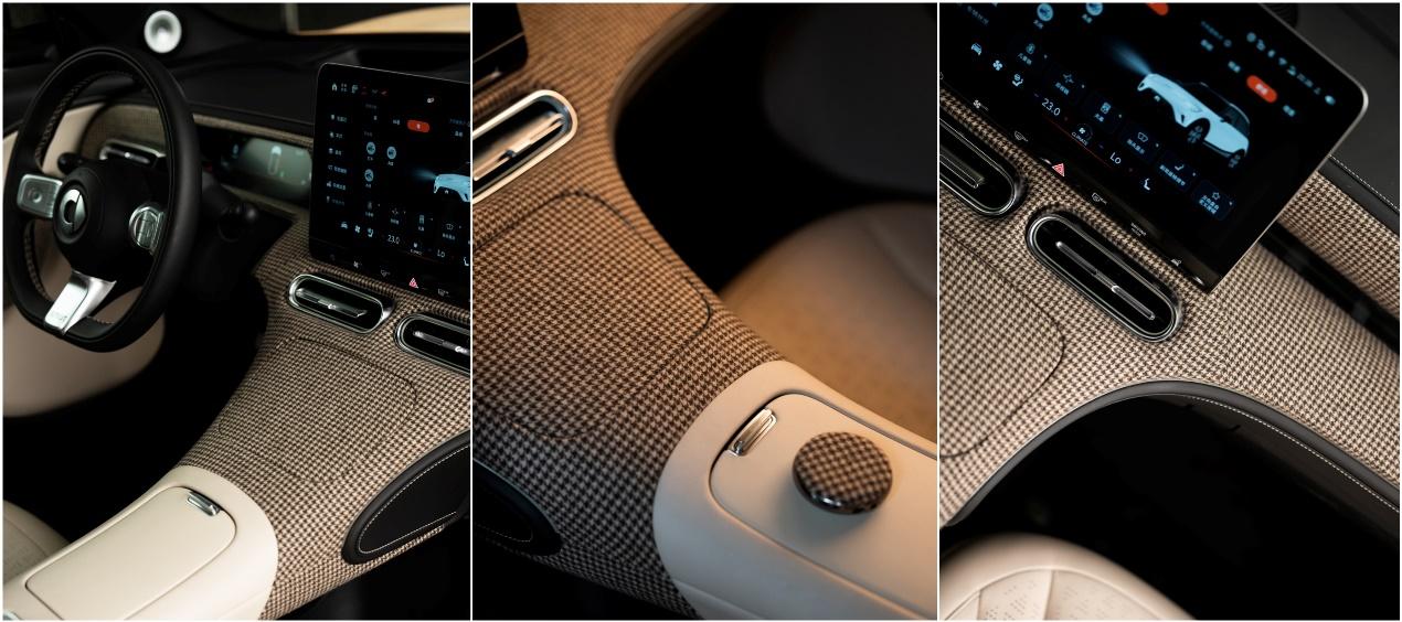 此次亮相的smart #1「漫游棕迹」改装车,是smart跨界时装趋势的突破之作:知名改装设计师李鄂将2025秋冬MONOCHROME BROWN潮流融入汽车设计,车身采用日本东丽奥司维®浅棕翻毛皮,车顶搭配羊毛千鸟格“帽饰”,轮毂与后视镜以分层棕调呼应;内饰延续千鸟格面料与精致皮质包覆,实现内外风格统一。作品传递“自在且高级”的生活态度,与smart #1“新奢灵动SUV”气质深度契合,成为秋冬城市生活方式的具象表达。