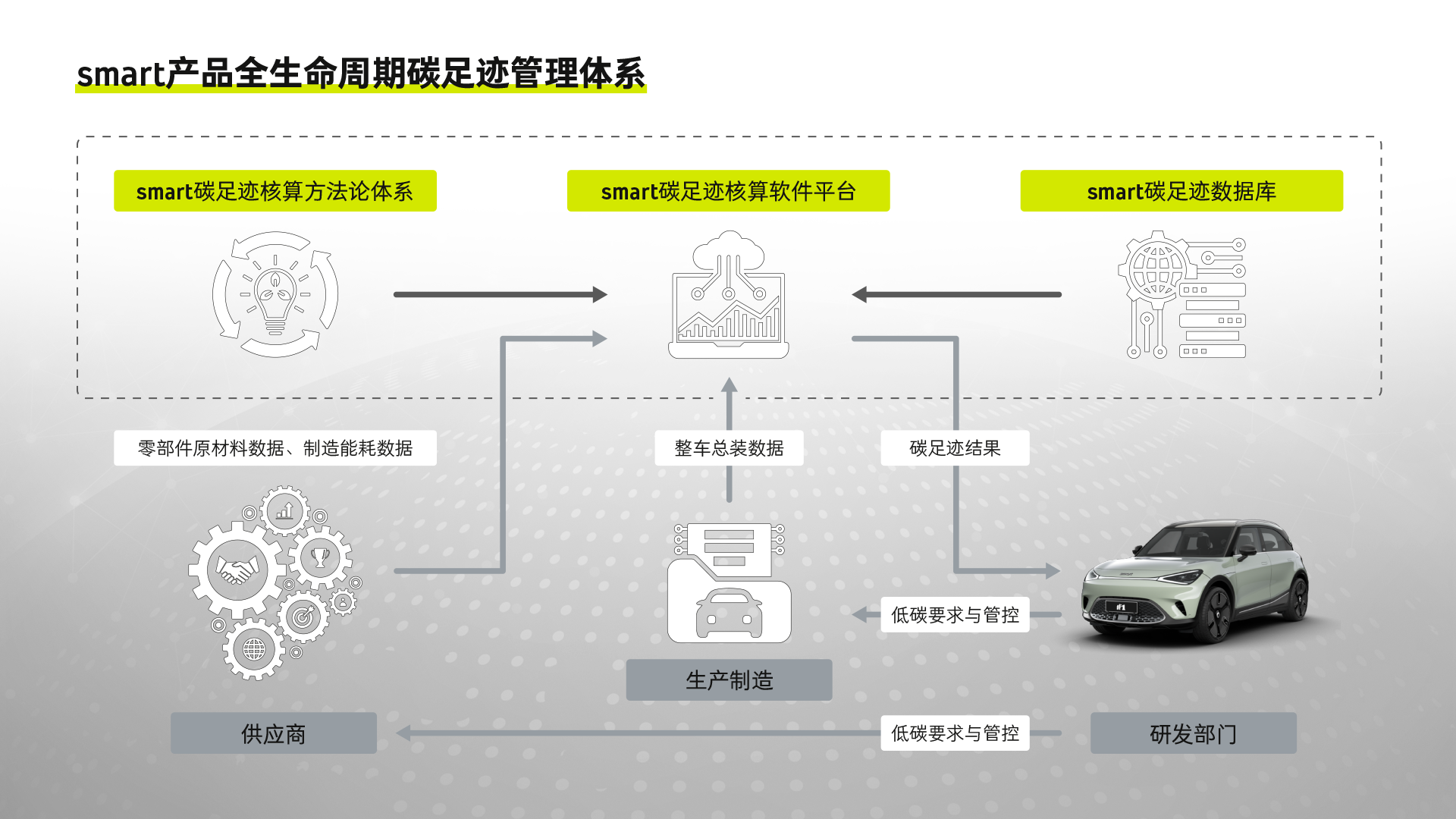 在全球“碳中和”大背景下,smart品牌以“脱碳化”为己任,将碳管理能力作为实现可持续发展的核心内容。早在2021年,smart就设立整车生命周期碳足迹研究专项,逐步构建起整车全生命周期碳足迹核算能力。