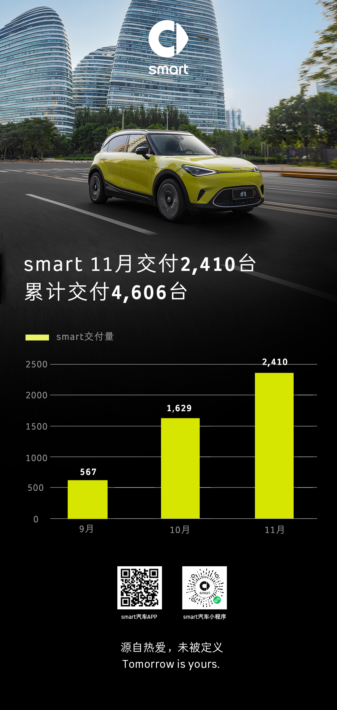 (2022年12月5日,杭州)今日,新奢纯电汽车科技品牌 smart正式公布2022年11月交付数据:11月1日至30日,全新smart精灵#1在华共交付2,410台。自9月23日正式开启交付至11月30日,smart累计在华交付4,606台。
