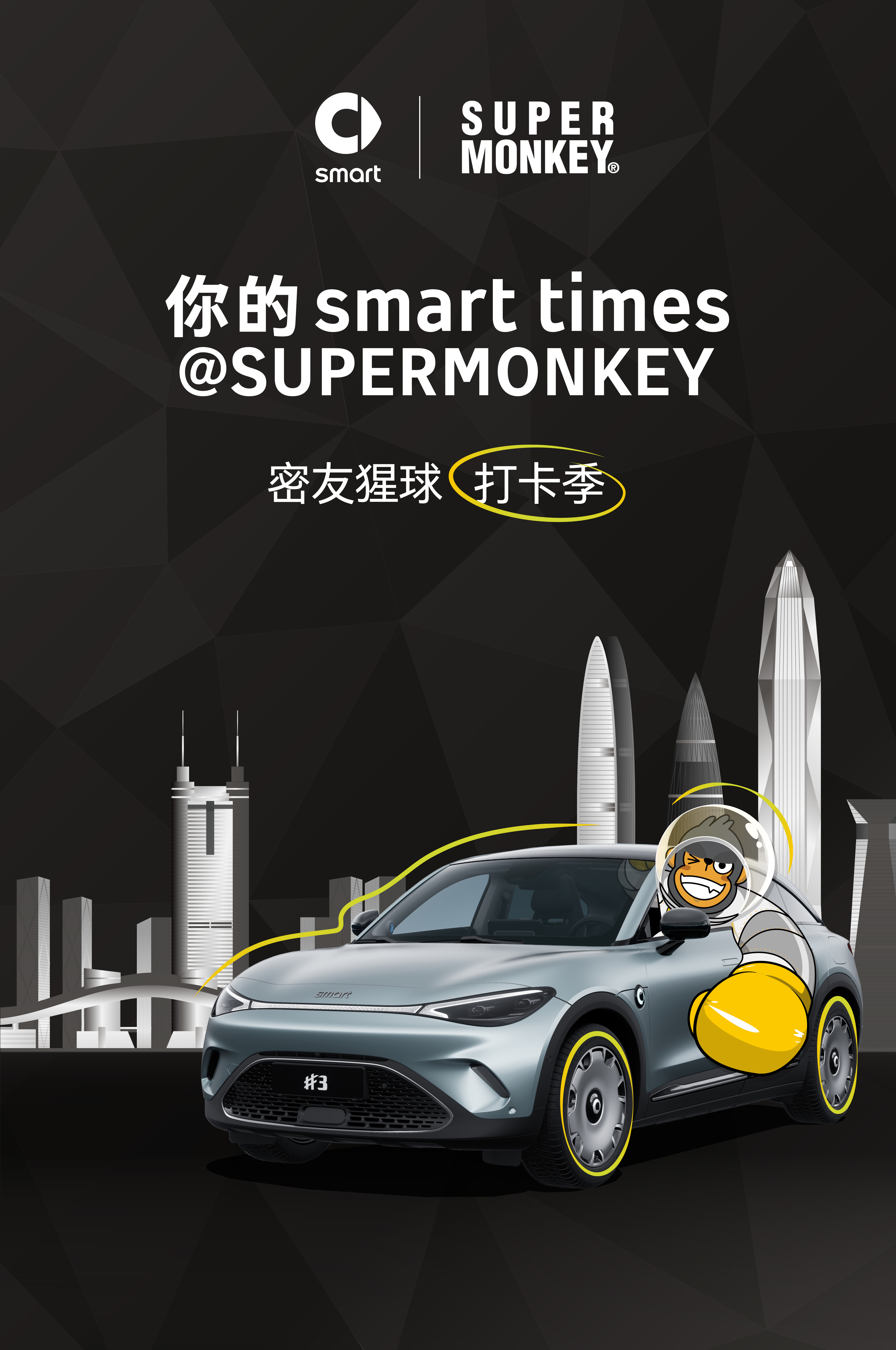 smart作为全球新奢都市生活方式品牌,致力于为都市年轻族群打造更具smart特色的生活方式。都市运动品牌SUPERMONKEY,则将“为每个城市人打造全新的健康生活方式”作为品牌追求。以“热爱”会友,smart与SUPERMONKEY一拍即合,用运动唤醒更多人对生活的热爱。