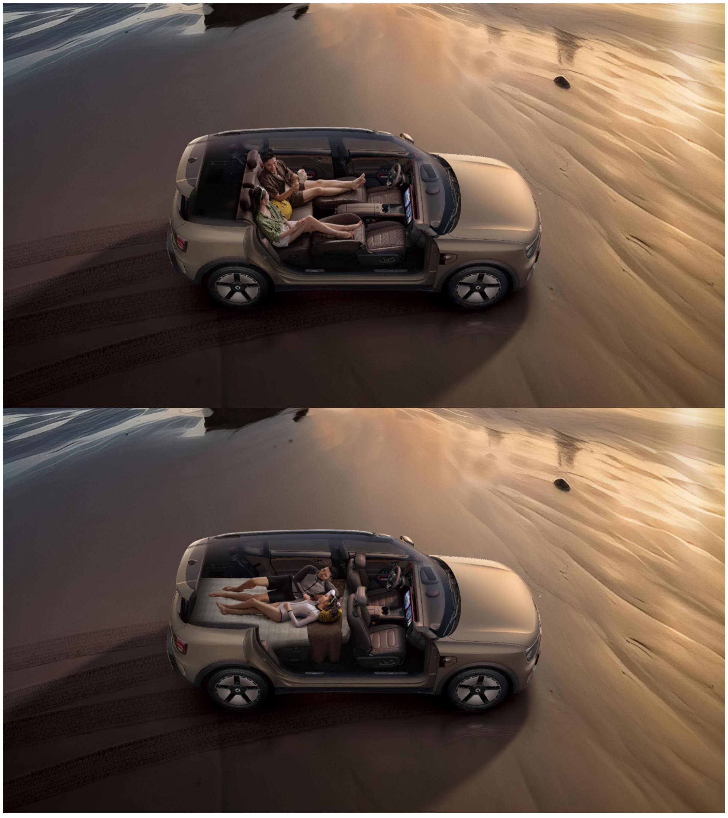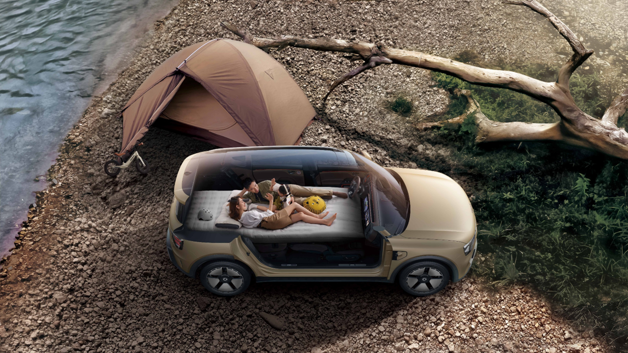 倘若是三五好友结伴度假或全家总动员,怎么将每个人都照顾得无微不至?得益于“四轮四角”的布局,smart 精灵#5轴距高达2900mm,更是拥有同级罕见的85%超高得房率,车内前后排每位乘员都能轻松实现二郎腿、贵妃躺自由!露营搭帐篷太麻烦?睡车里也很宽敞!启动“多人躺平模式”,放平后排所有座椅、前排靠背、连通后备箱,拼成1.4m x 2.7m超级大平层,一家三口轻松车内过夜,舒适温馨又宁静,享受新奢度假的超凡乐趣。