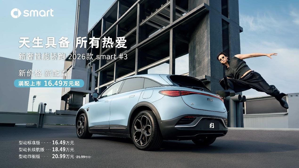 (2025年7月11日,杭州)今日,新奢性能轿跑2026款 smart 精灵3号携新价格、新配置,炸场而来!2026款 smart 精灵#3官方指导价为16.49-20.99万元,smart 精灵#3 BRABUS性能版官方指导价为25.99万元。全系标配多项新奢配置,包括13扬声器Beats音响、64色双区氛围灯、侧翼发光Logo、可发光金属迎宾踏板、赛博光影贯穿式LED大灯、方向盘加热等。此外,2026款 smart 精灵#3新增月瓷白、星尘蓝两款人气车色,多种内外饰组合随心搭。