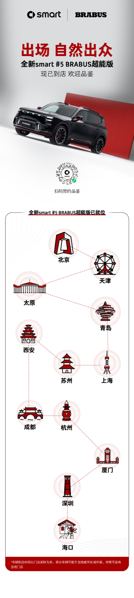 (2025年5月1日)继米兰全球首秀后,smart #5 BRABUS超能版于上海车展正式上市,上市即火爆,受到众多网友关注和喜爱,更成为高端性能玩家的购车首选。为回应市场的热切期待,smart迅速推进部署。目前,#5 BRABUS超能版展车,已在北京、上海、深圳及江苏、浙江、山东、四川等十余个省市地区陆续到店。用户可到店体验性能巅峰之作——#5 BRABUS超能版,同时还能尊享限时一口价仅32.99万元。