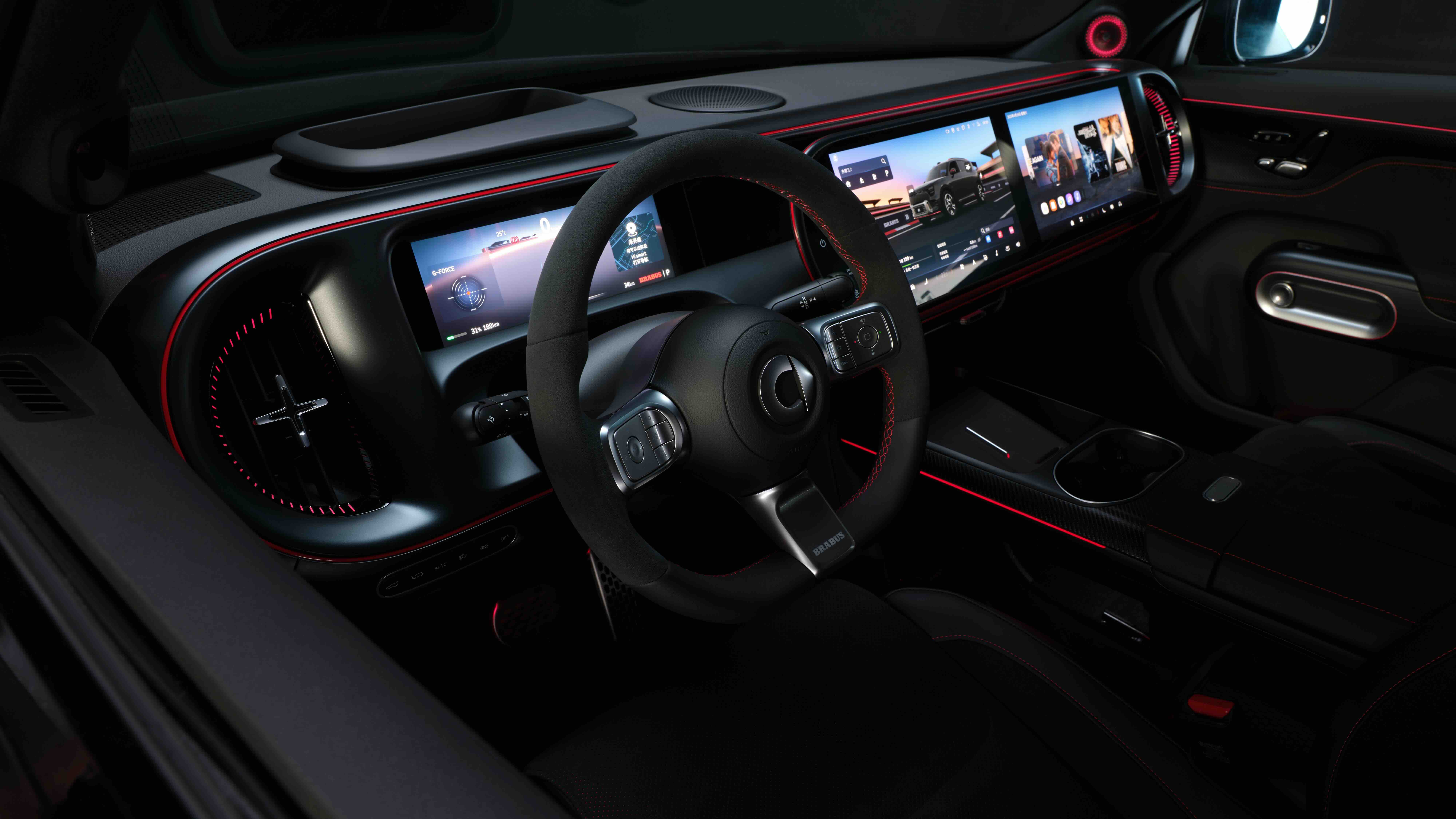 #5 BRABUS超能版搭载运动风道、扰流板与BRABUS大G同款21英寸轮毂,四活塞刹车系统及专属的“Performance”徽标,尽显性能姿态与设计锋芒。内饰方面,#5 BRABUS超能版通过发光BRABUS字样的Alcantara方向盘、Dinamica材质座椅,完美融合了运动氛围与顶级质感。
