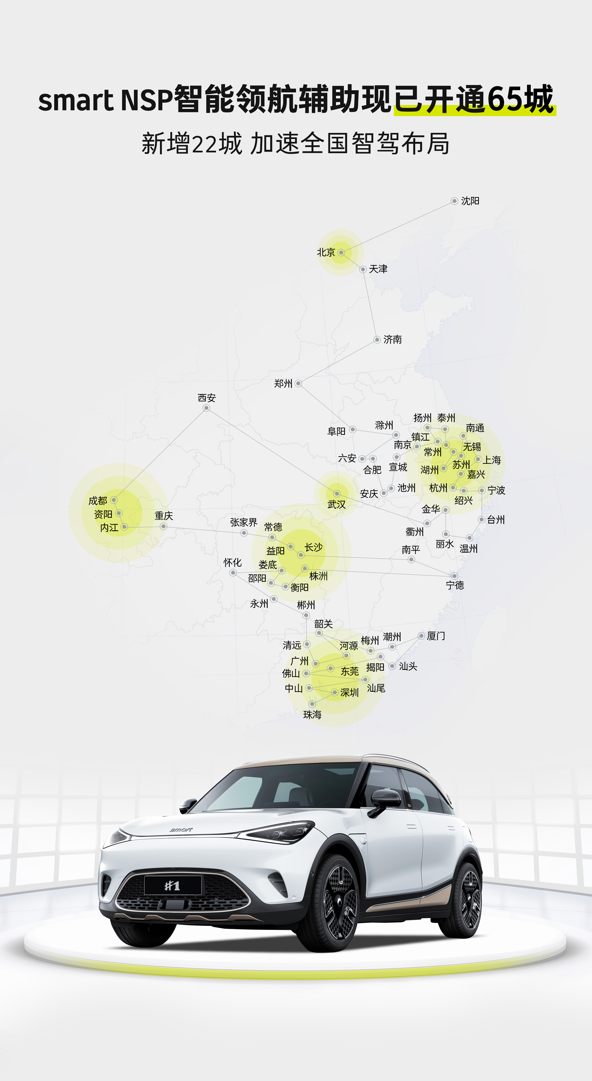 (2024年4月3日,杭州)今日,新奢智能纯电汽车品牌smart宣布,smart Pilot Assist 2.0搭载的NSP智能领航辅助现已覆盖全国65城。近期新增开通22城,分别是:湖州、宣城、揭阳、梅州、汕头、河源、潮州、汕尾、娄底、常德、怀化、益阳、邵阳、张家界、永州、清远、衡阳、郴州、韶关、六安、阜阳及株洲,更多城市持续解锁中。smart正不断加速全国智能辅助驾驶布局进程,将前沿智能辅助驾驶技术带给更多密友,让每一次出行都更smart点。