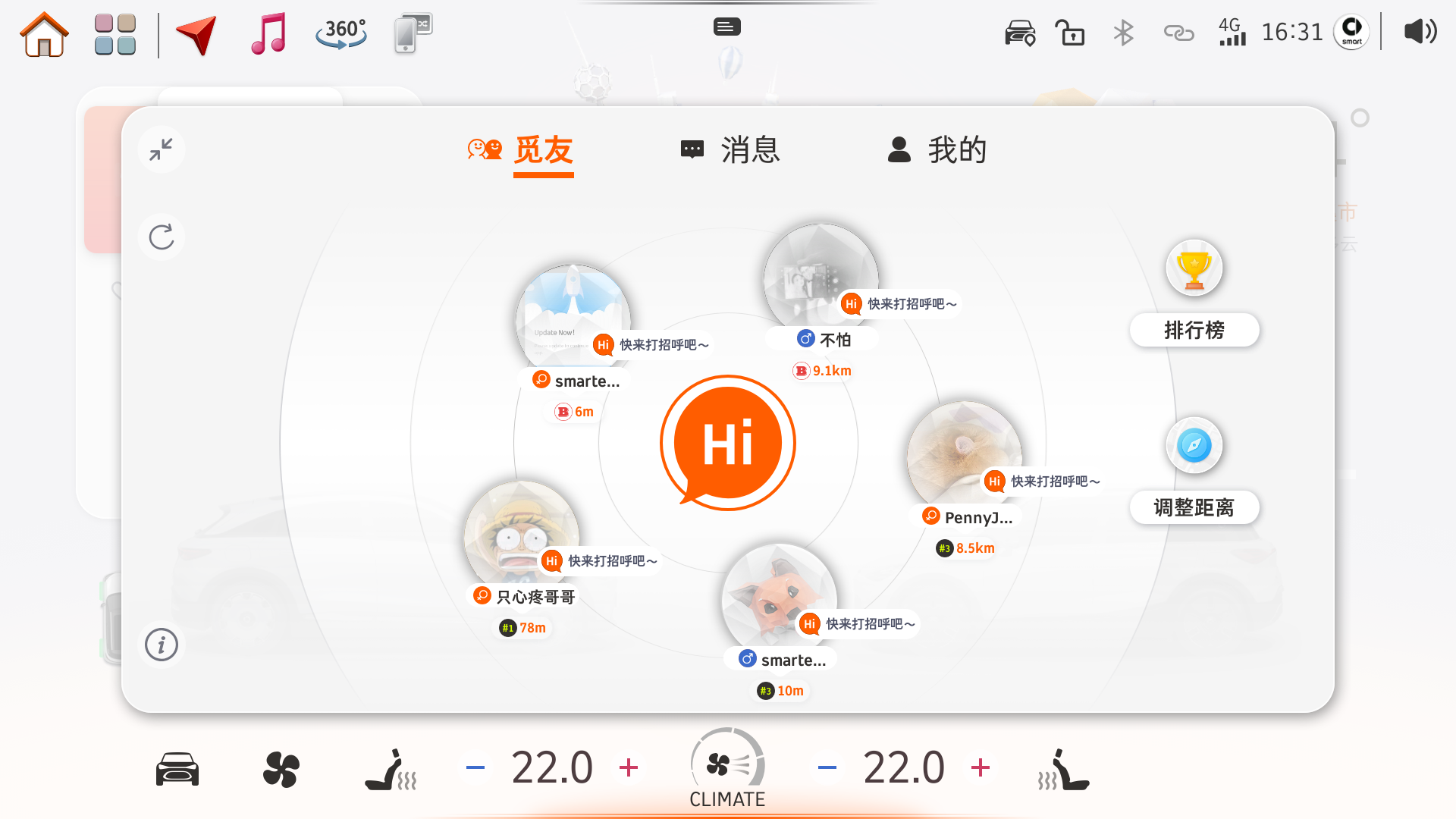 浪漫夏日,一键偶遇。本次OTA升级,smart为志趣相投的密友解锁社交新灵感,新增“密友偶遇”功能,可编辑个人资料、标签,设置觅友范围,支持与附近车友打招呼、发语音、互相关注、跨距离聊天等,随时随地在线摇人,纵享1+1+N的“零距离社交”。